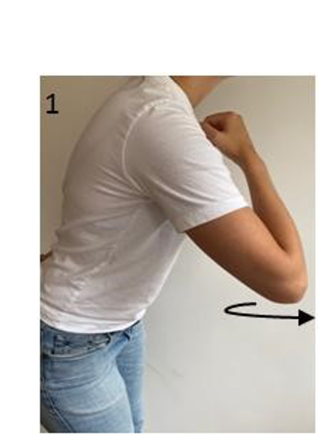 • Druk uw gestrekte arm tegen de zijkant van uw lichaam. Houd dit een aantal seconden vol en laat los. Zie foto 2.