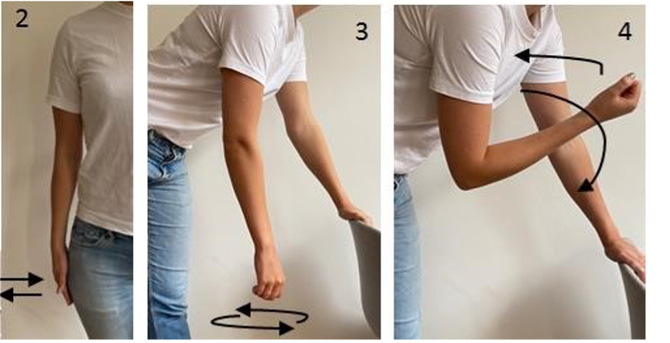 • Ga iets gebukt voorover staan en maak kleine cirkelbewegingen met de elleboog. Dit heet een pendelbeweging. Doe dit 10 tot 15 keer achter elkaar, 3 tot 4 keer per dag.
