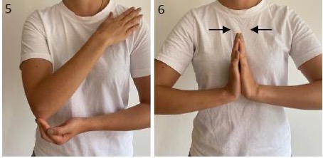 • Plaats uw handen tegen elkaar voor uw borstkas en zet ze tegen elkaar. U voelt de spieren aan de voorkant van uw schouder aanspannen. Zie foto 6.