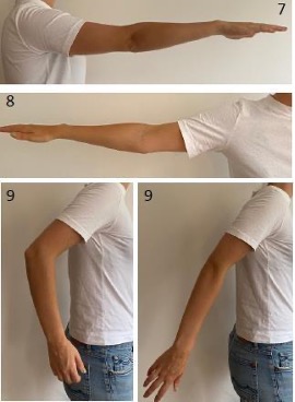 • Strek uw arm. Breng deze naar voren en til omhoog tot schouderhoogte. Zie foto 7. Probeer de arm hier even vast te houden.